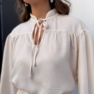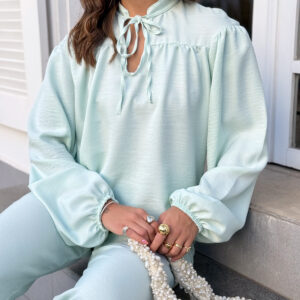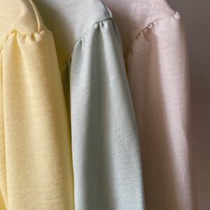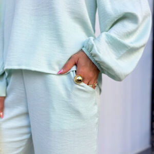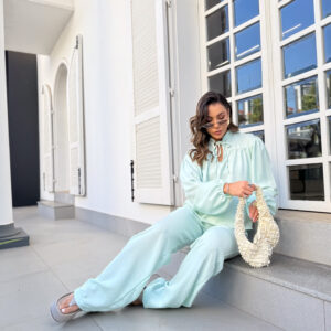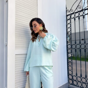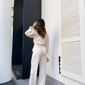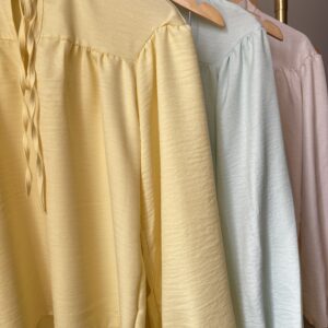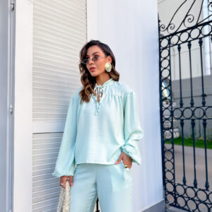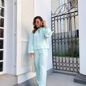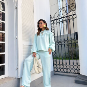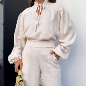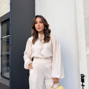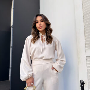 * Blusa, gola padre com amarração, manga com punho de elástico. Calça pantalona cos alto reta na frente e elástico atrás