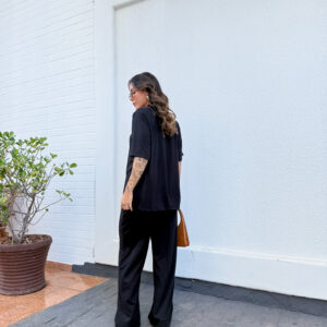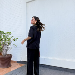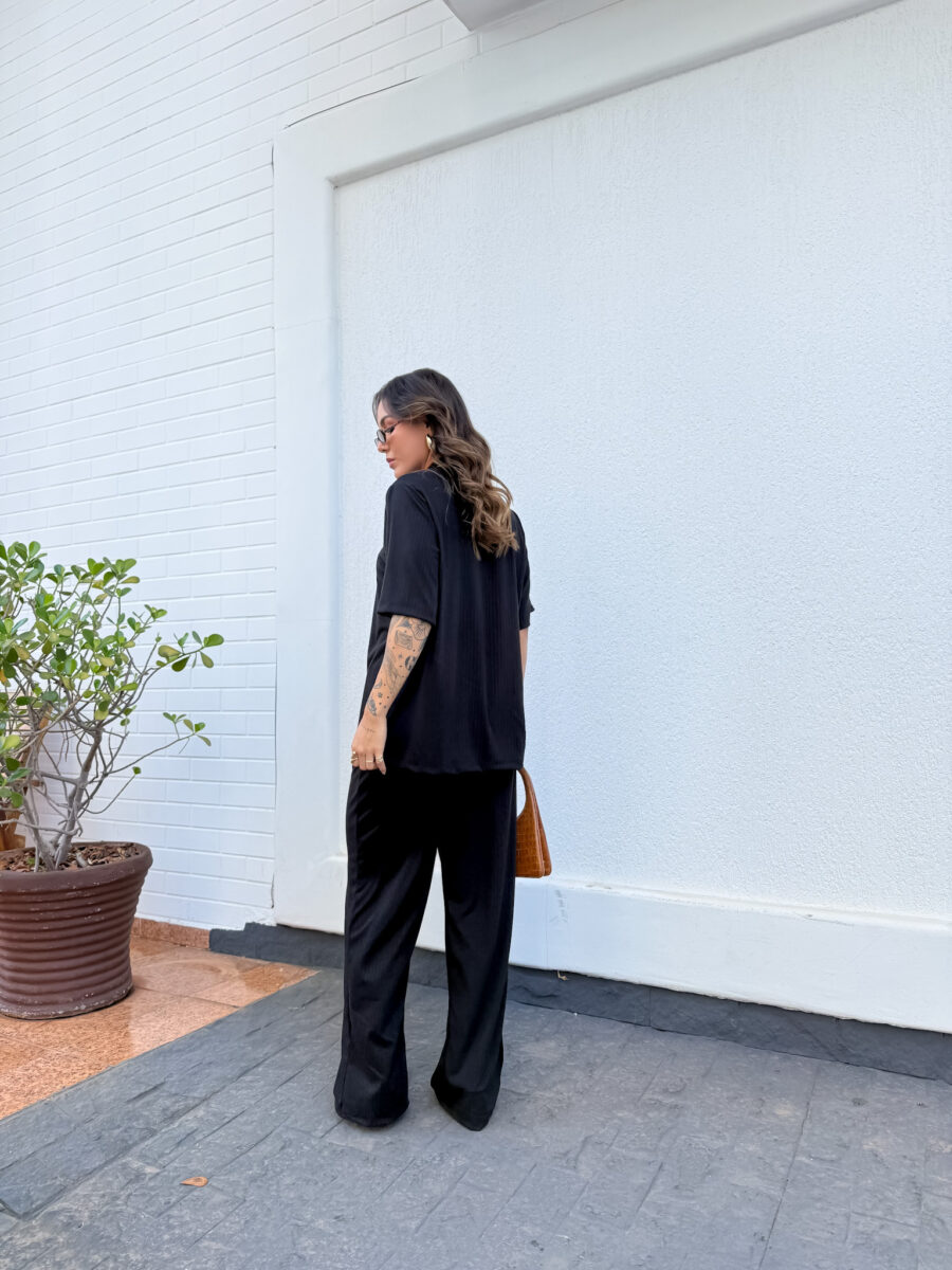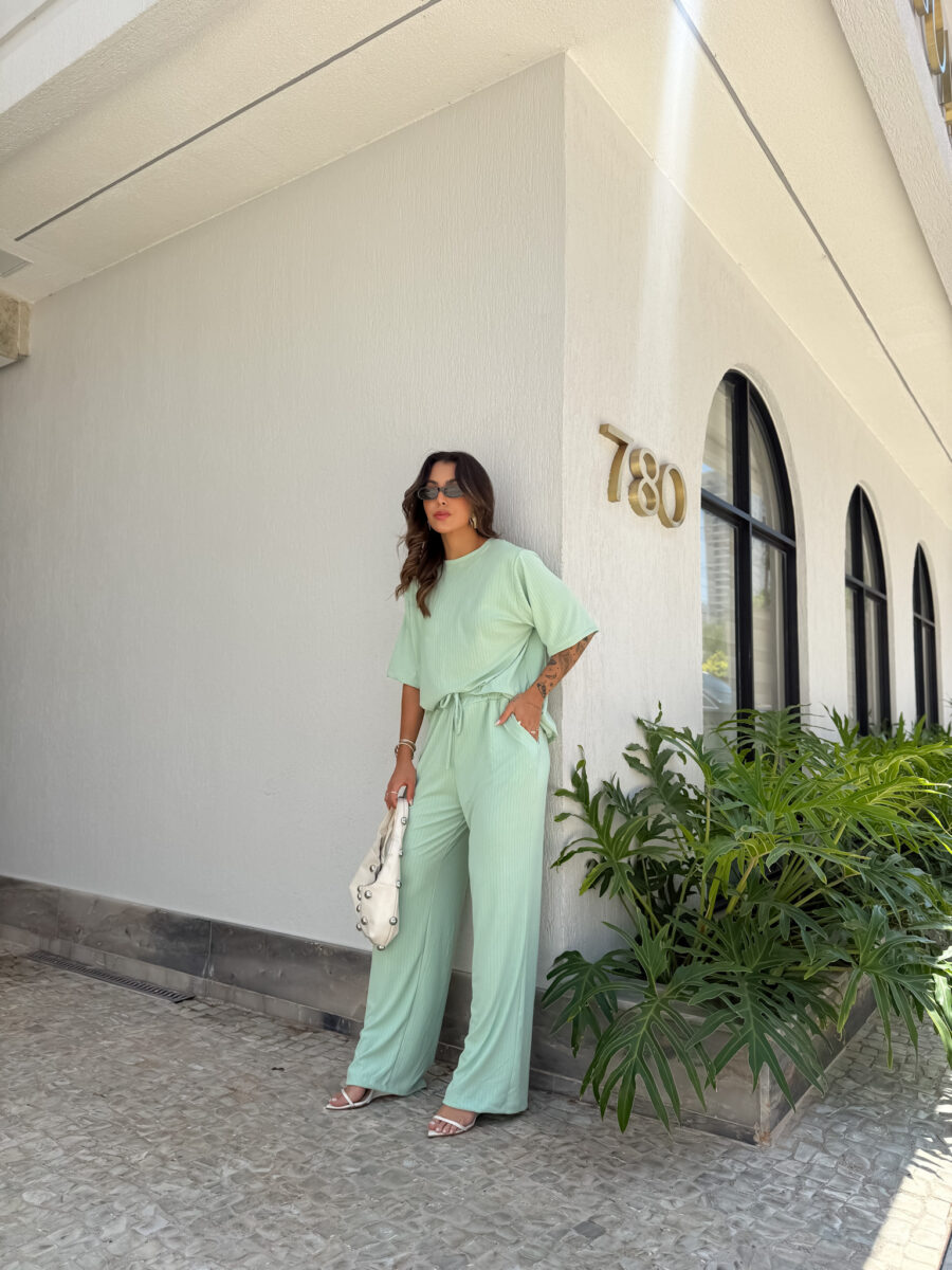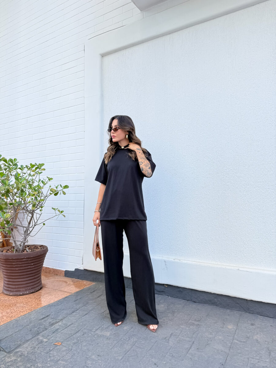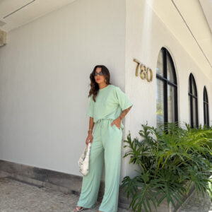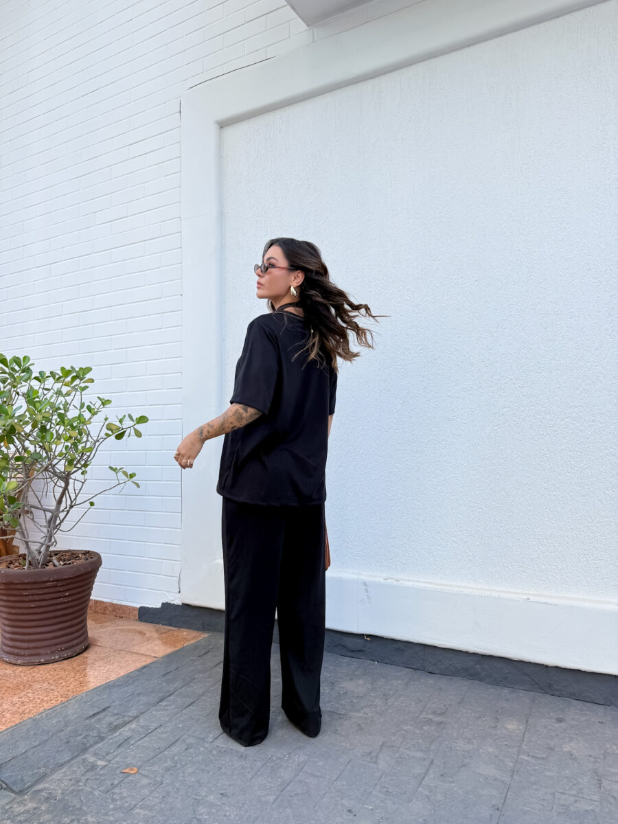 Tshirt cumprida, calça pantalona cos alto, elástico e bolso na frente.