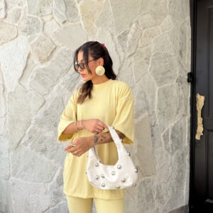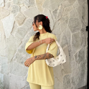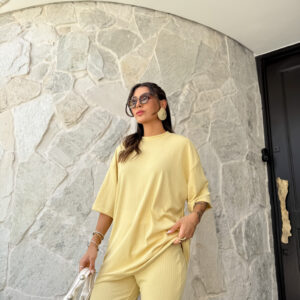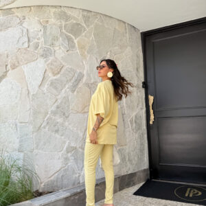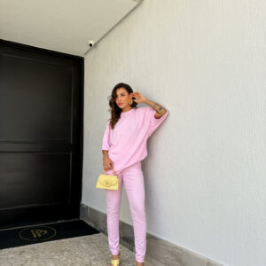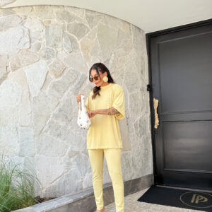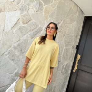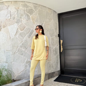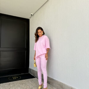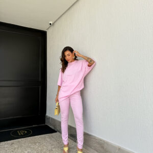 T Shirt alongada com ombro mais caído, calça leggings cos de elástico.