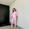T Shirt alongada com ombro mais caído, calça leggings cos de elástico.
