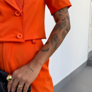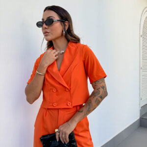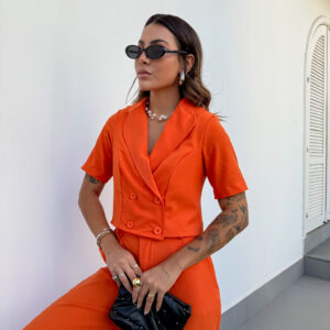 colete transpassado com botões, calça pantalona cos alto, zíper e bolso.
