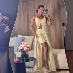 Conjunto com túnica + bermuda; Túnica com alça ajustável, botões e peito duplo, Bermuda cos alto bolso na frente.