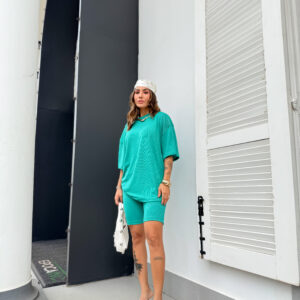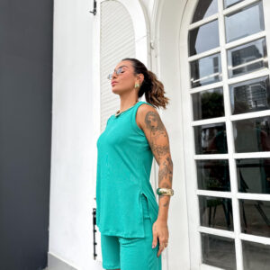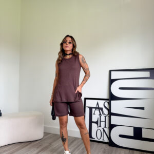 Blusa cavada, abertura nas laterais, Bermuda cos alto com bolso e cos de elástico.