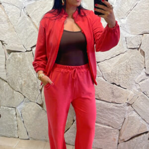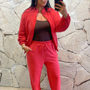 Jaqueta bomber com punhos em elástico, zíper na frente e bem despojada. Calça pantalona cos alto com cos de elástico bolso na frente.