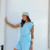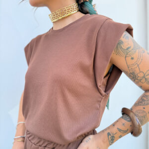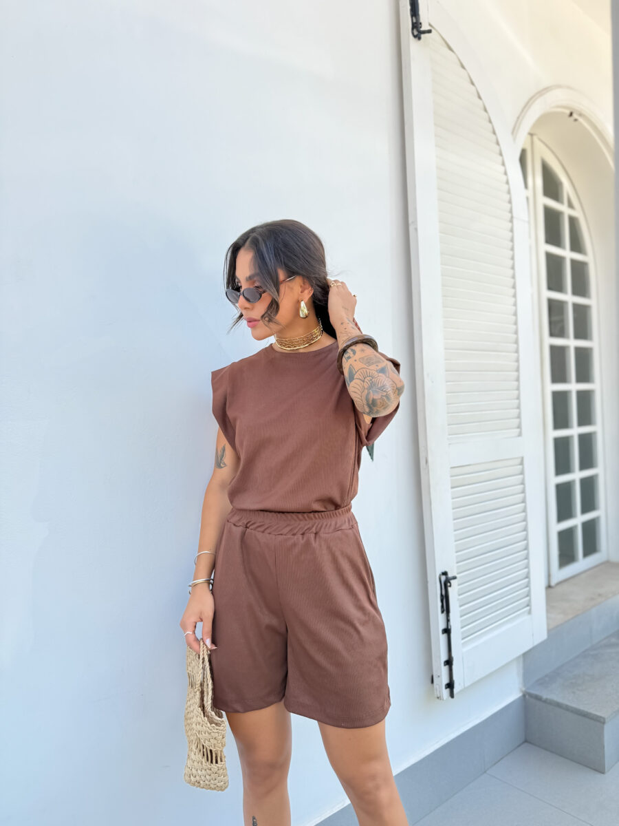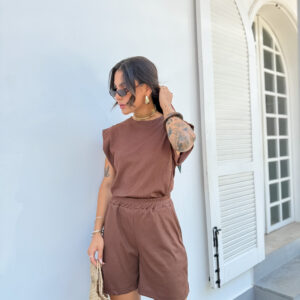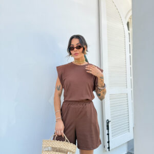 Blusa Muscle tee, short cos alto bolso na frente e elástico na cintura. Bermuda mais cumprida.