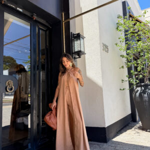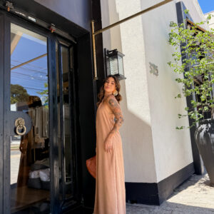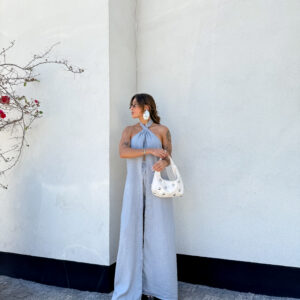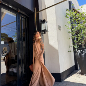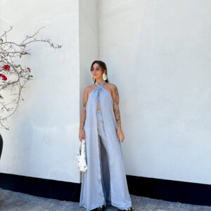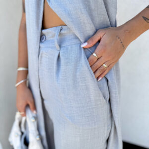 Conjunto túnica, calça pantalona cos alto bolso e botão, Túnica frente única com elástico atrás, peito duplo e traspassada na frente.