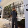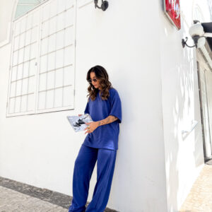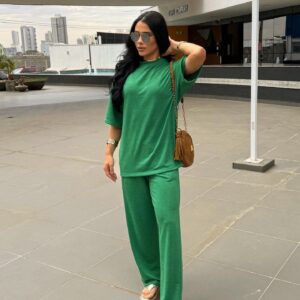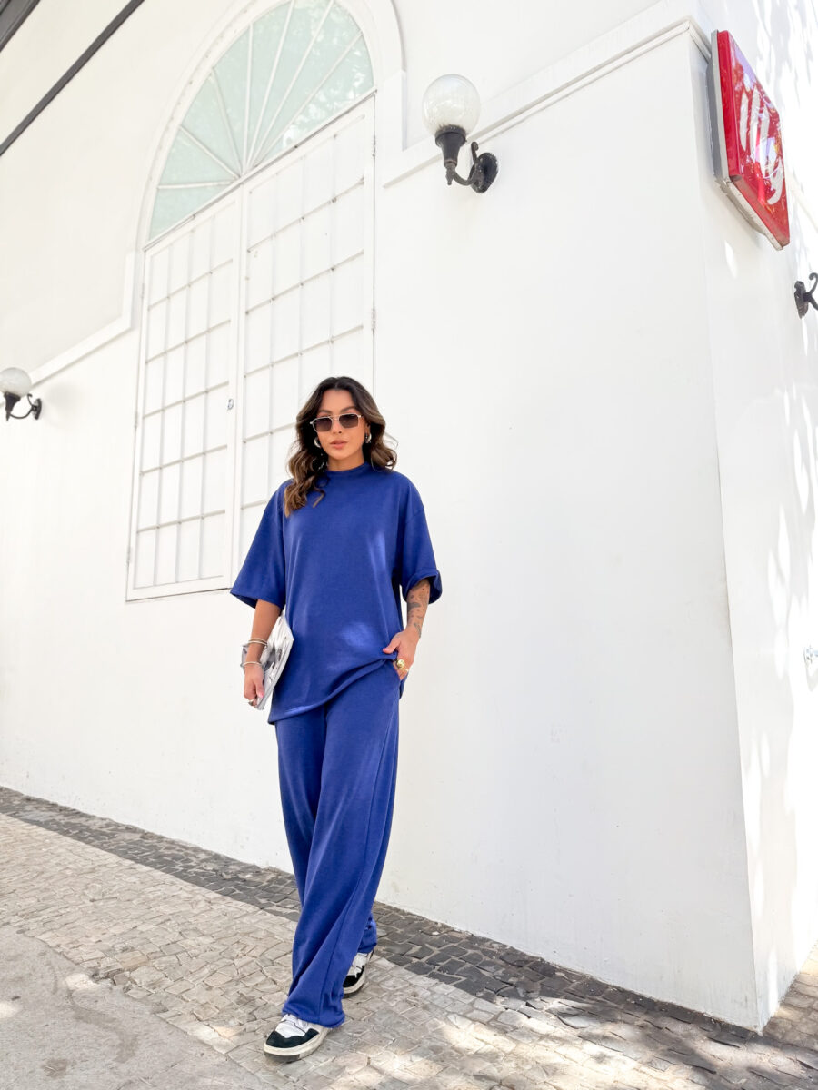 T Shirt mais comprida, e bem estilosa, calça pantalona cos alto e bolso na frente.