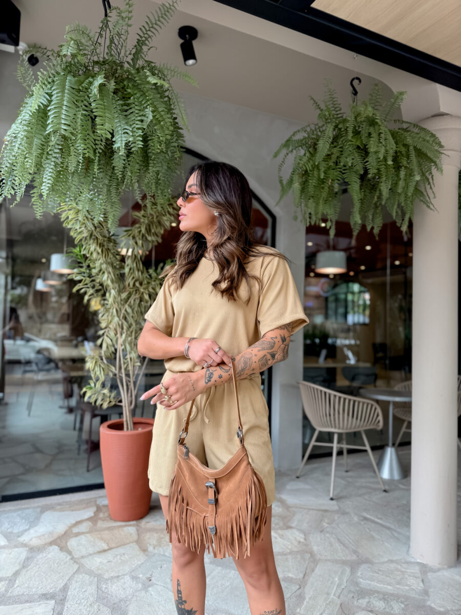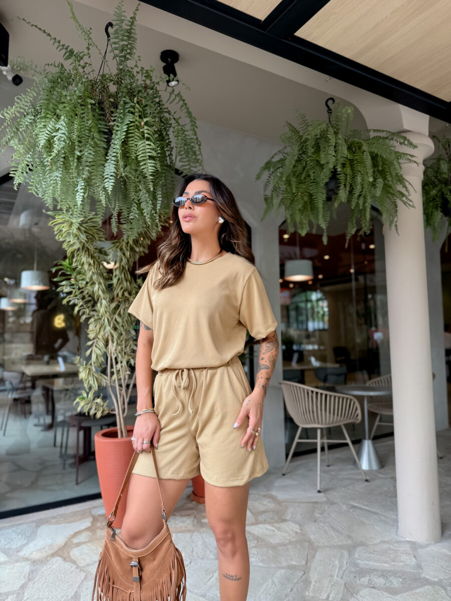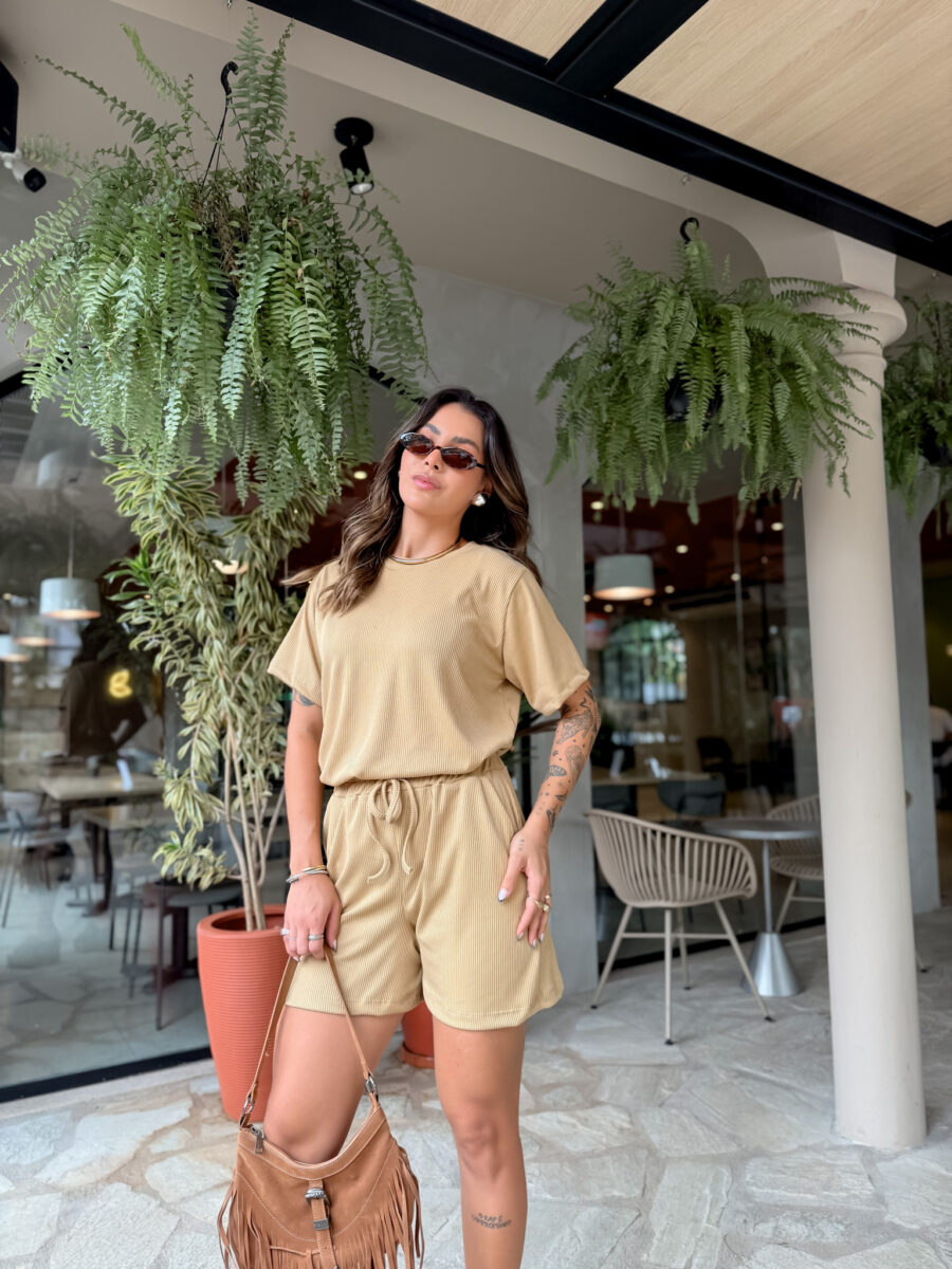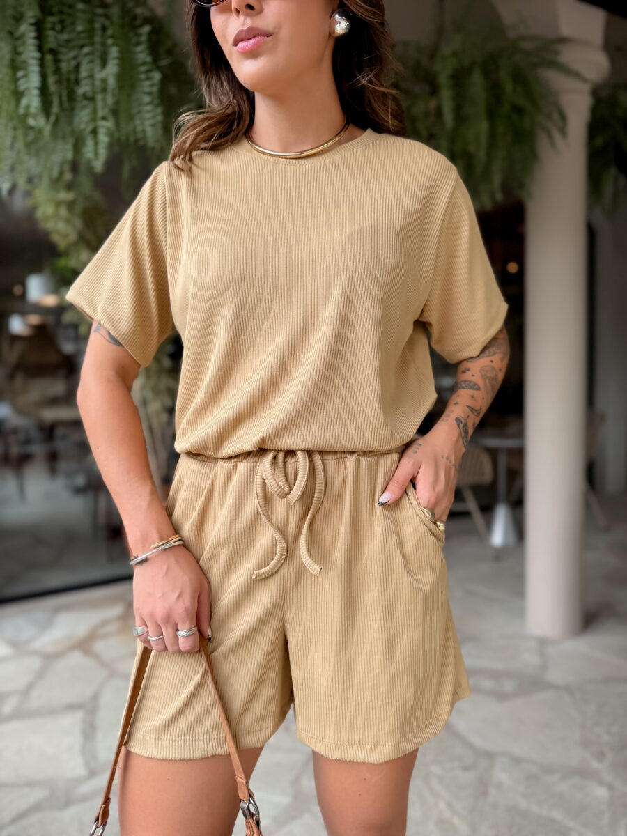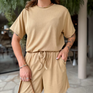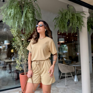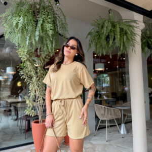 T Shirt mais comprida, short cos alto com elástico e bolso na frente