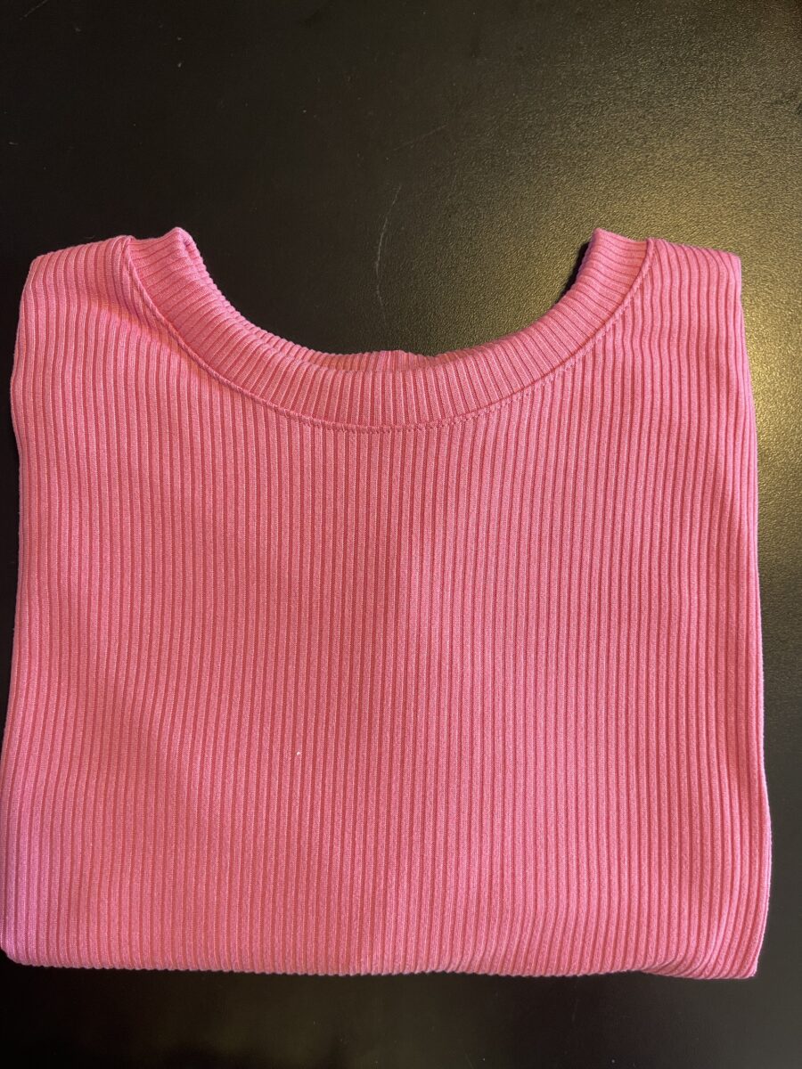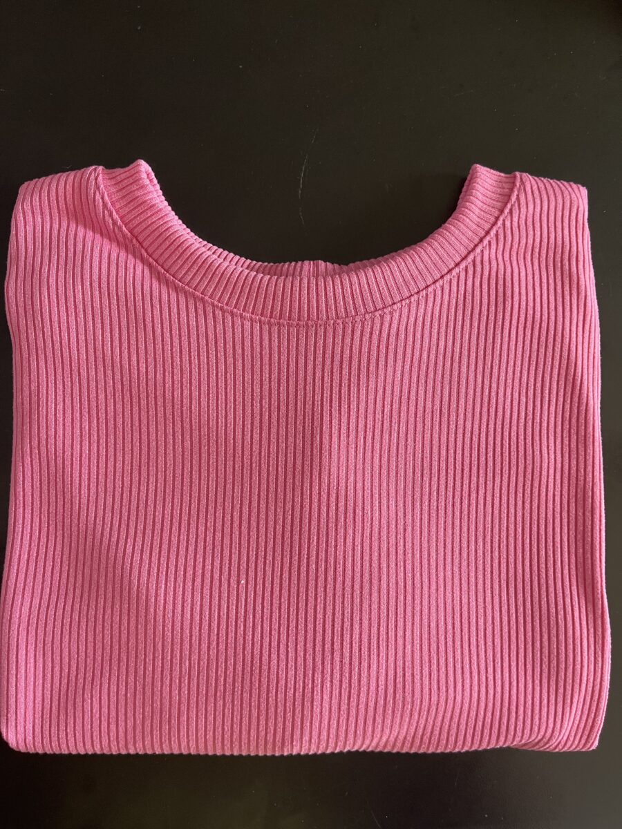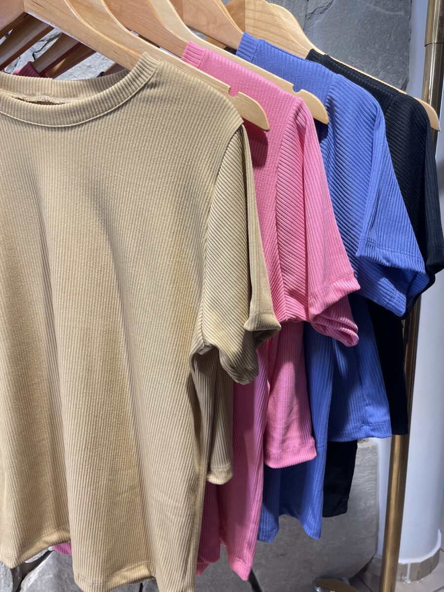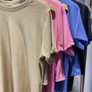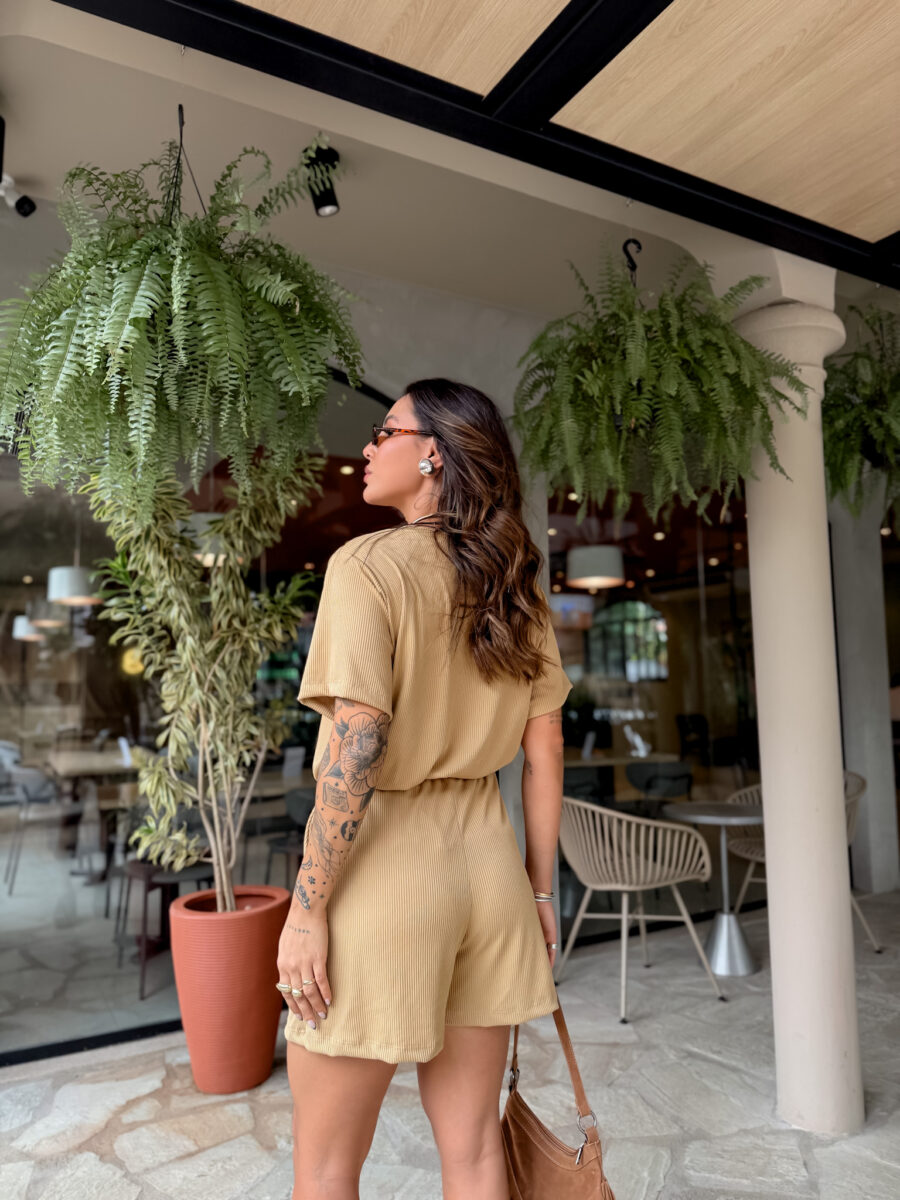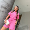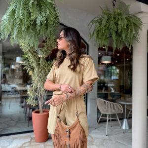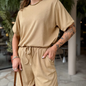 T Shirt mais comprida, short cos alto com elástico e bolso na frente