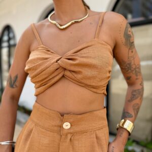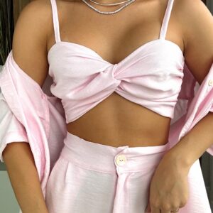Camisa manga curta com bolso, Bermuda cos alto bolso e botão, Cropped Duplo lastex nas costas alça ajustável.