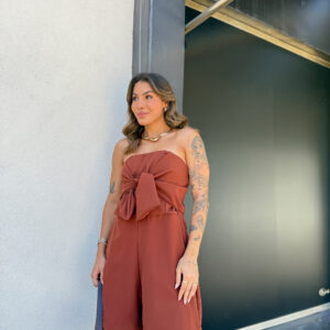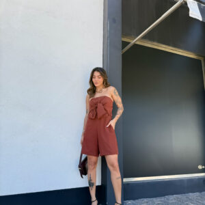 Macaquinho, com bolso amarração na frente, zíper a trás.