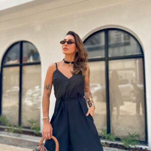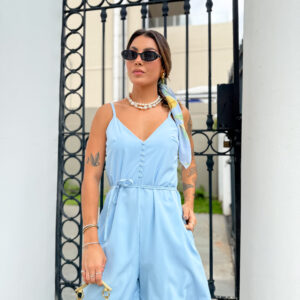 Macaquinho alça ajustável, botões encapados no mesmo tom do tecido, bolso na frente e zíper atrás. Acompanha Cordinha, Ótimo comprimento