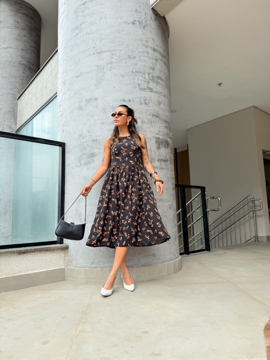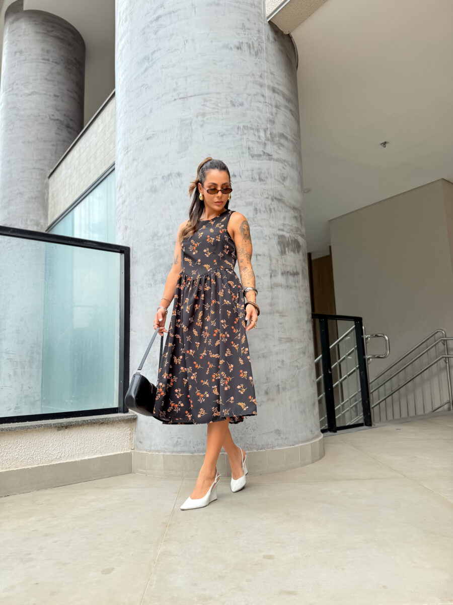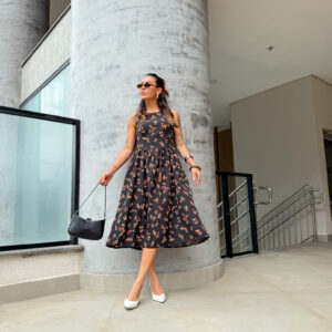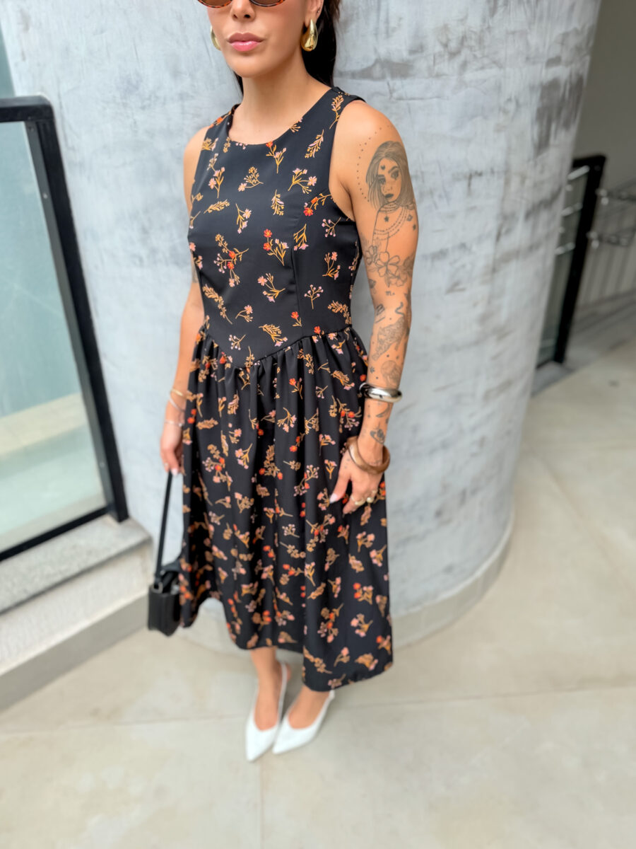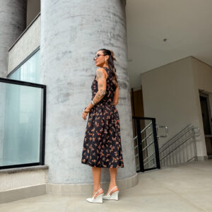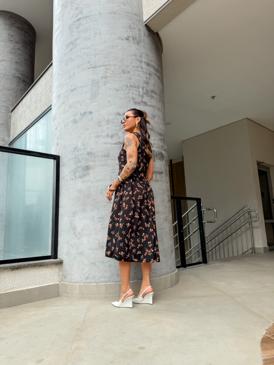 Vestido mídi cavado, redondo zíper atrás.