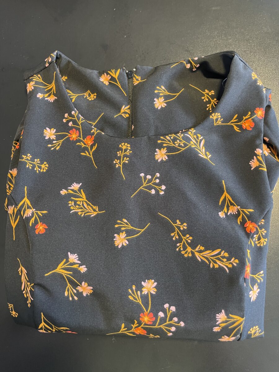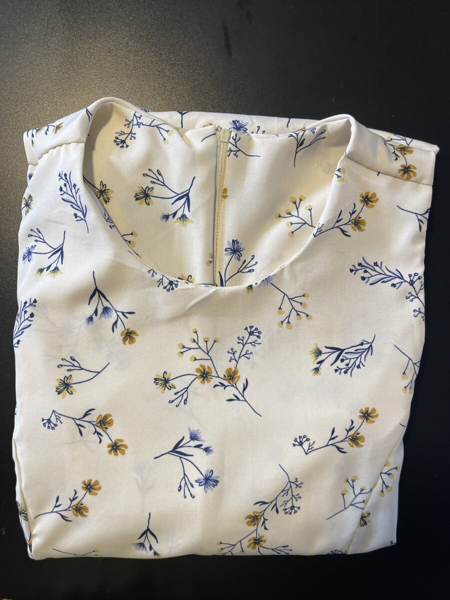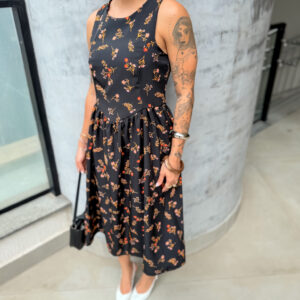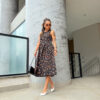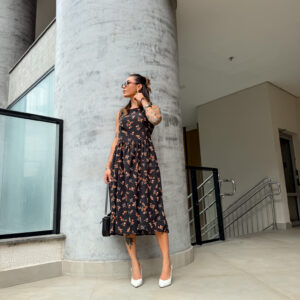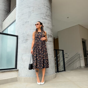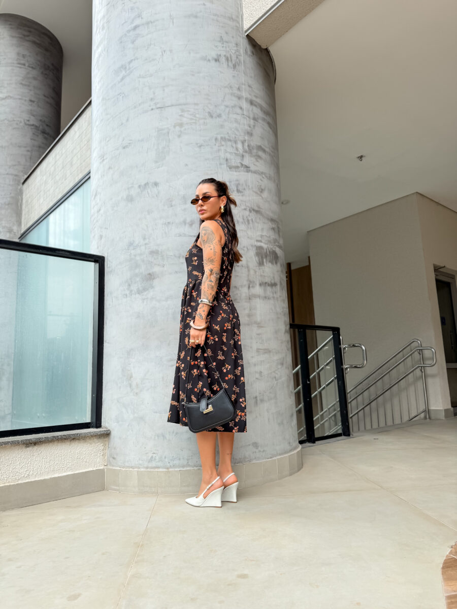 Vestido mídi cavado, redondo zíper atrás.