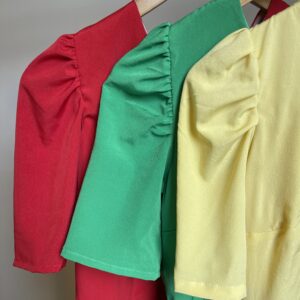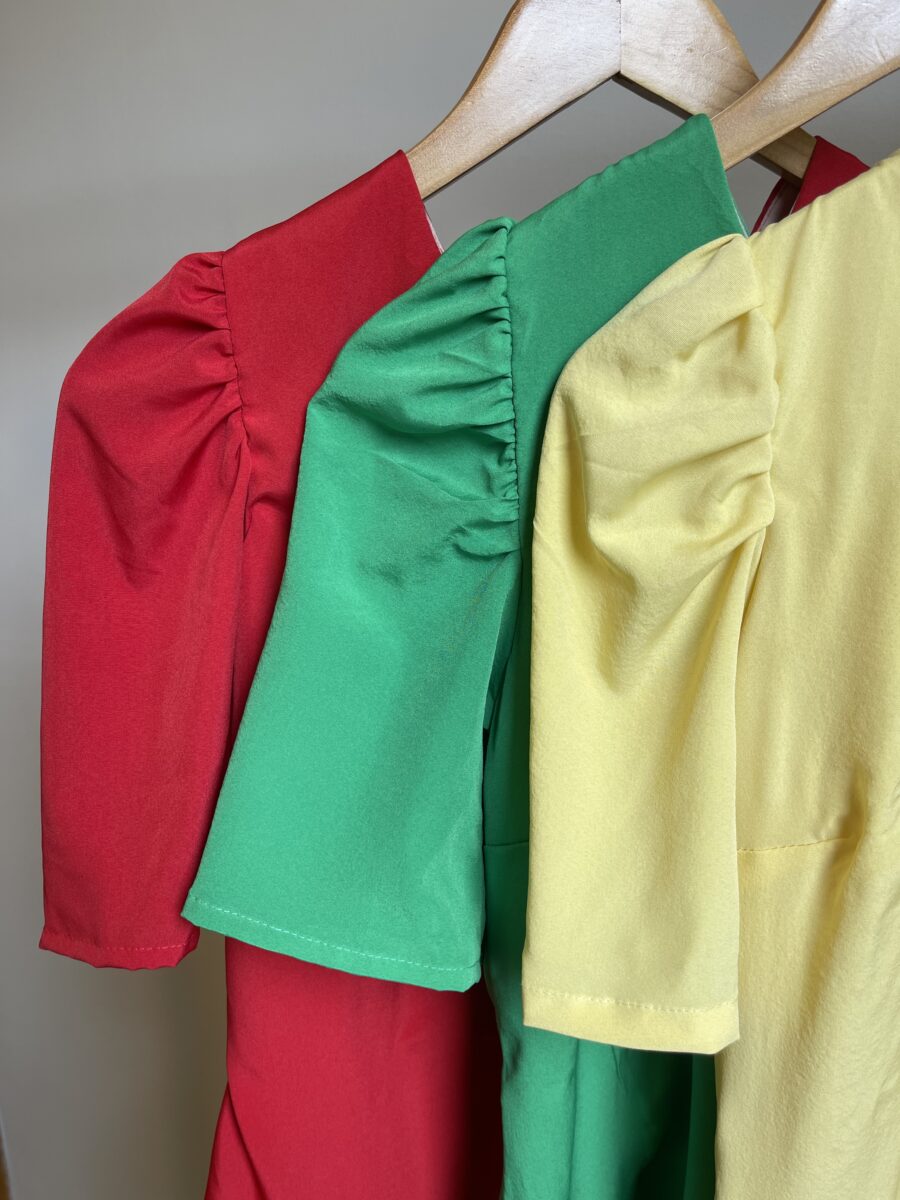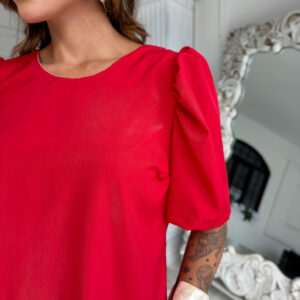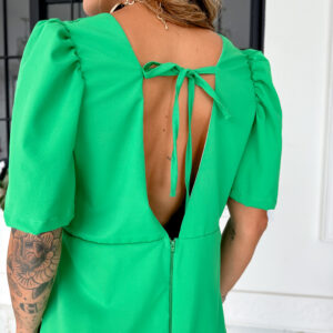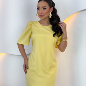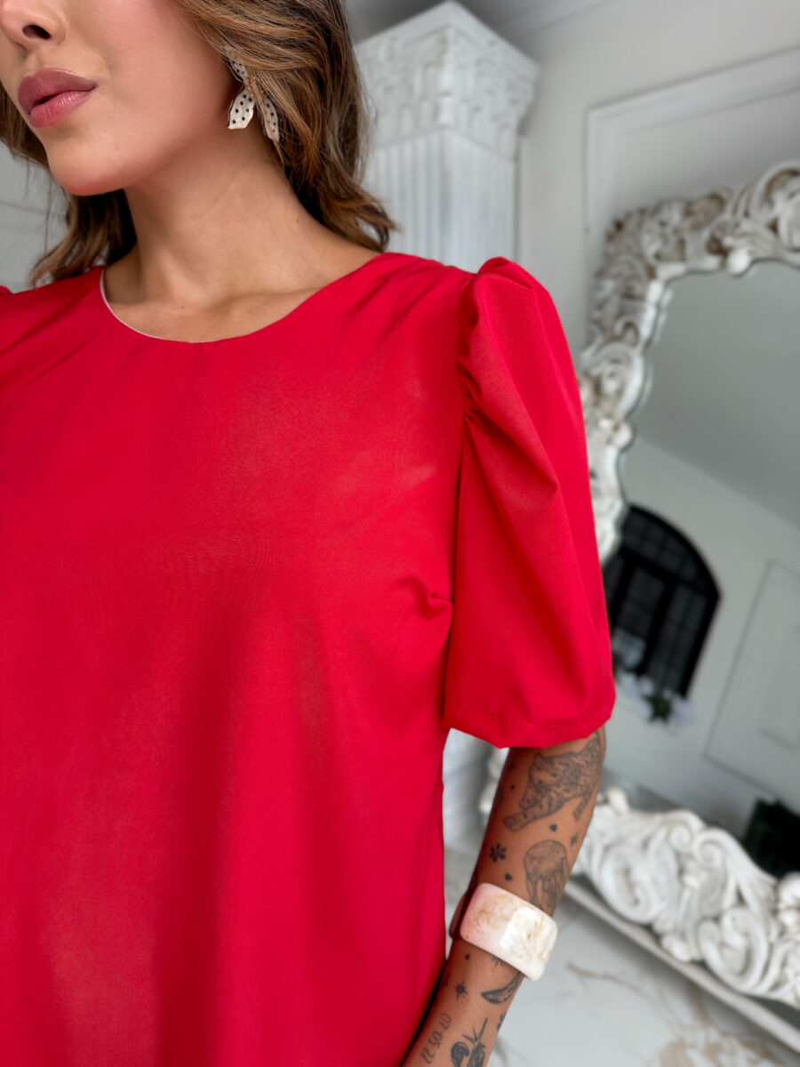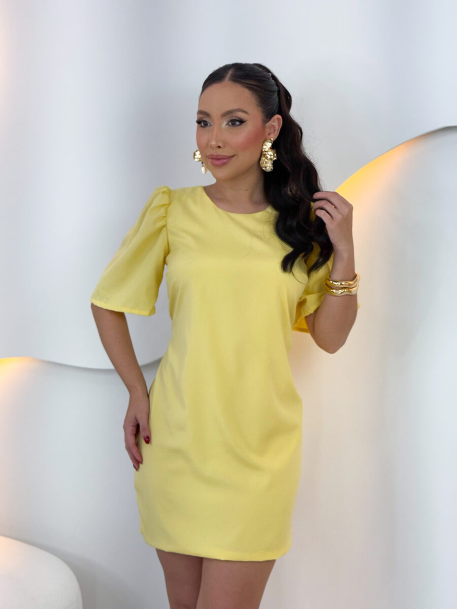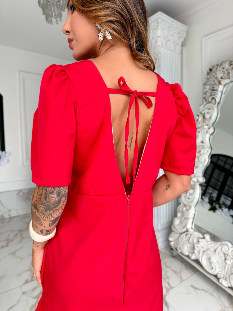 vestido curto, TODO FORRADO, zíper atrás, manga bufante e amarração atrás.