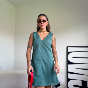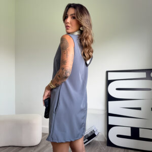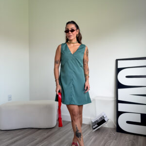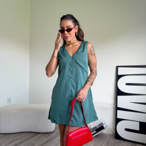 Vestido Curto com peito duplo recortes na frente e atrás, bolso na frente.
