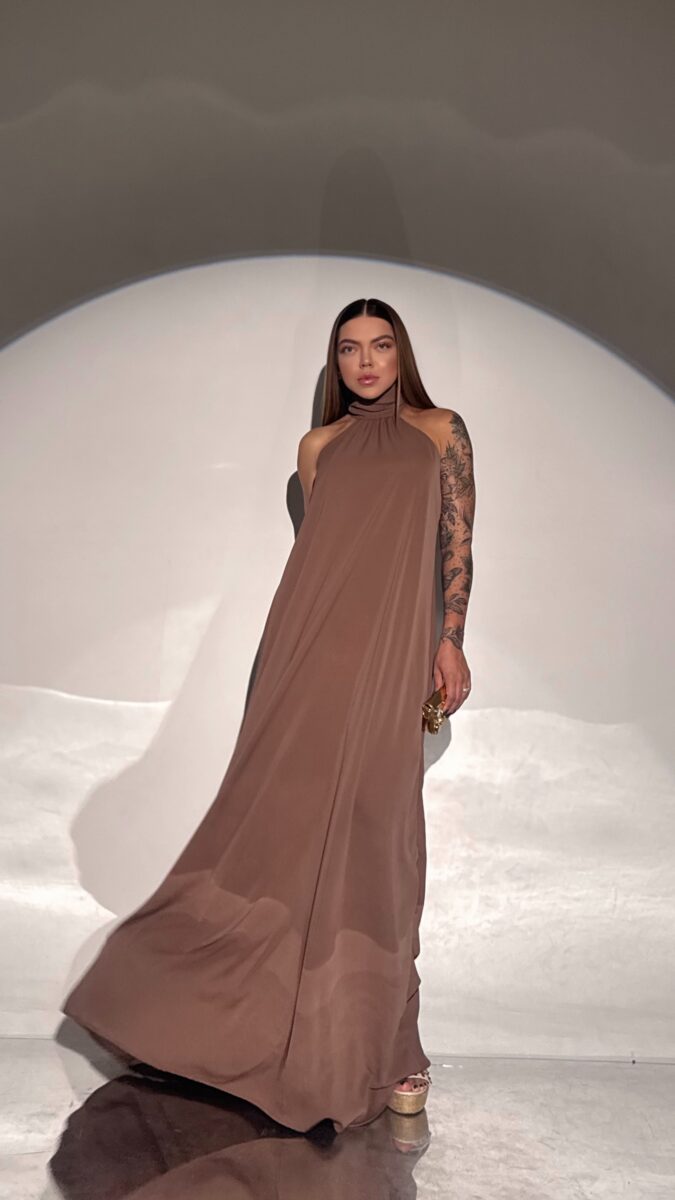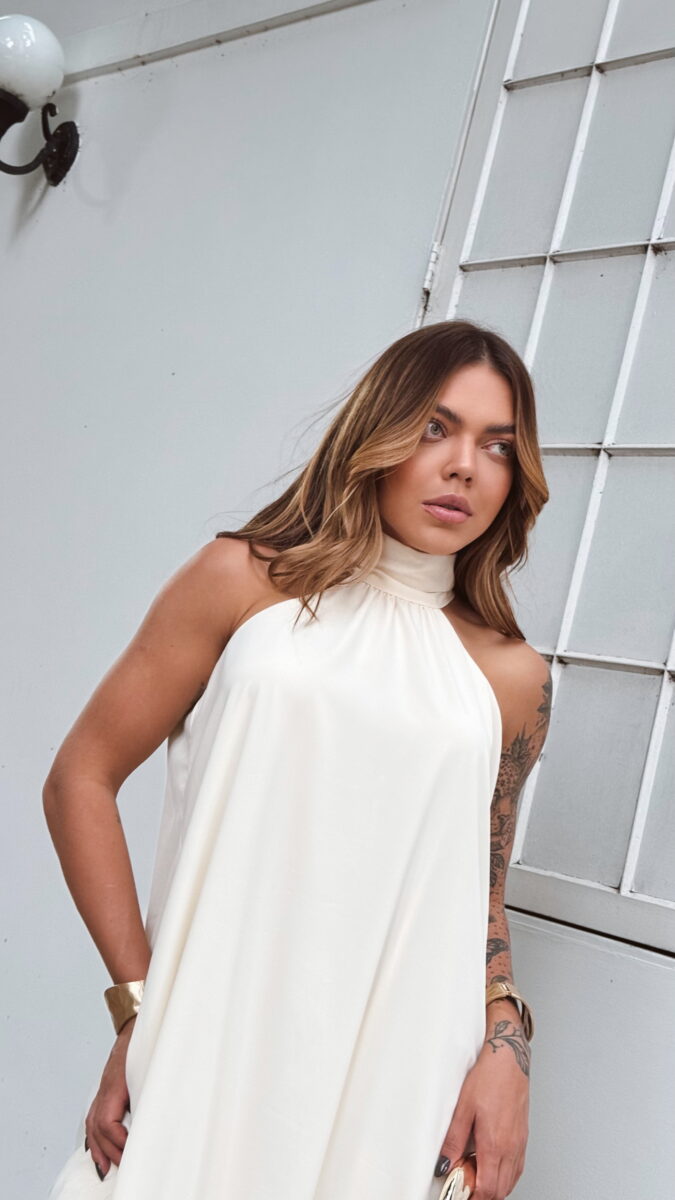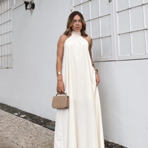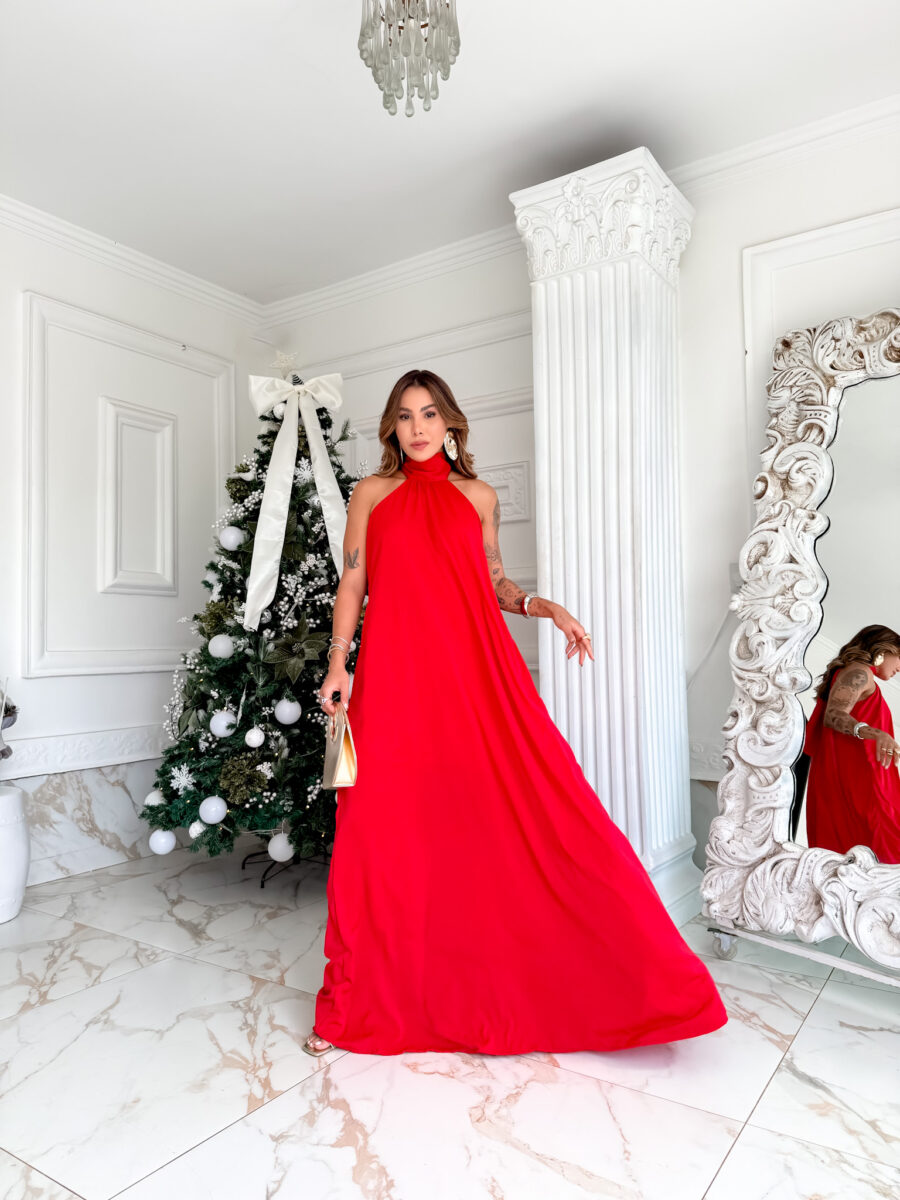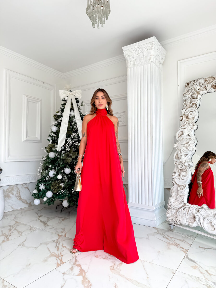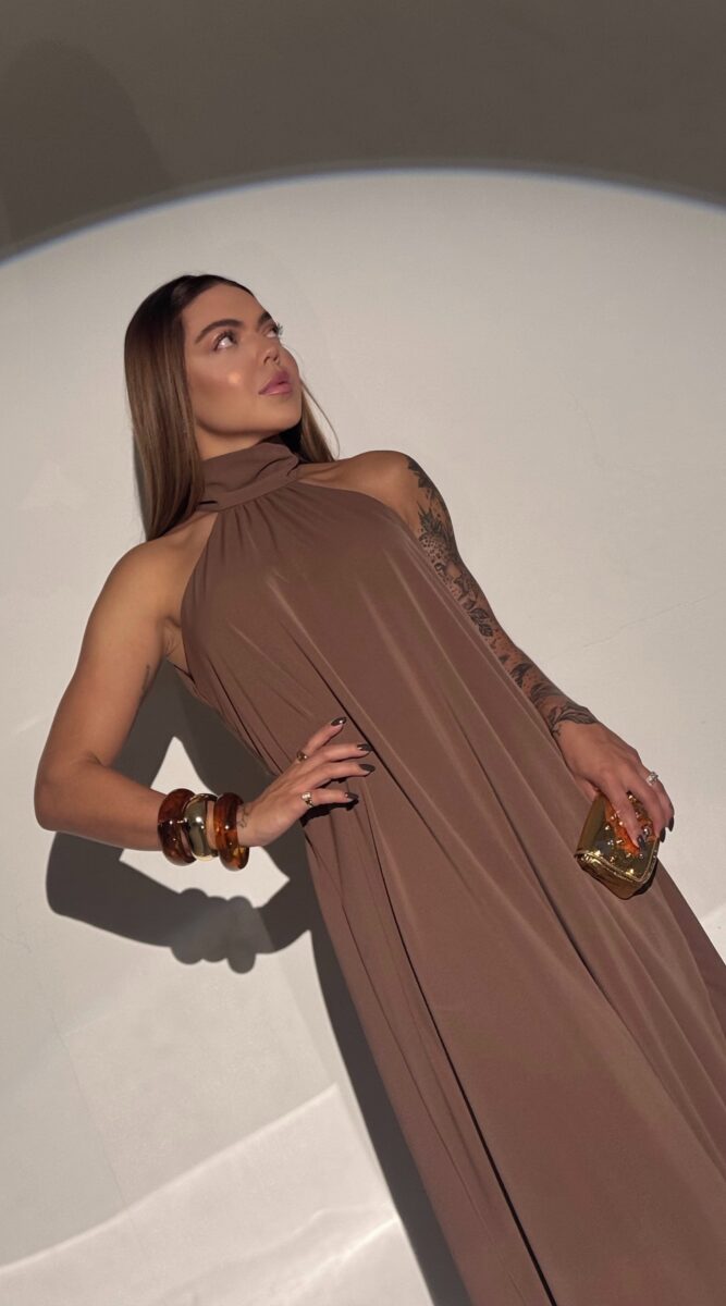 Vestido longo, Todo duplo, gola alta com amarração atrás, um leve abertura atrás. Tecido dele importado super elegante, com toque macio e com 2 % de elástano