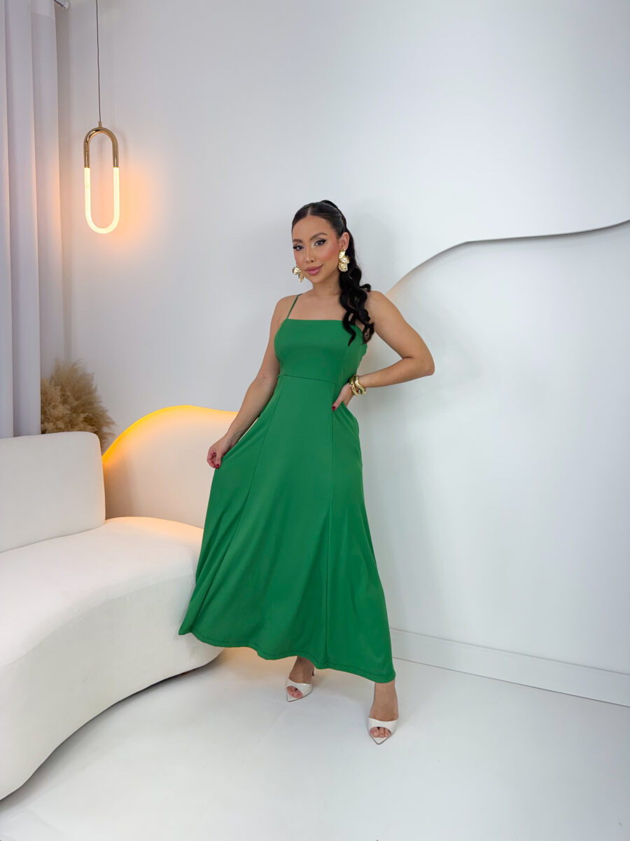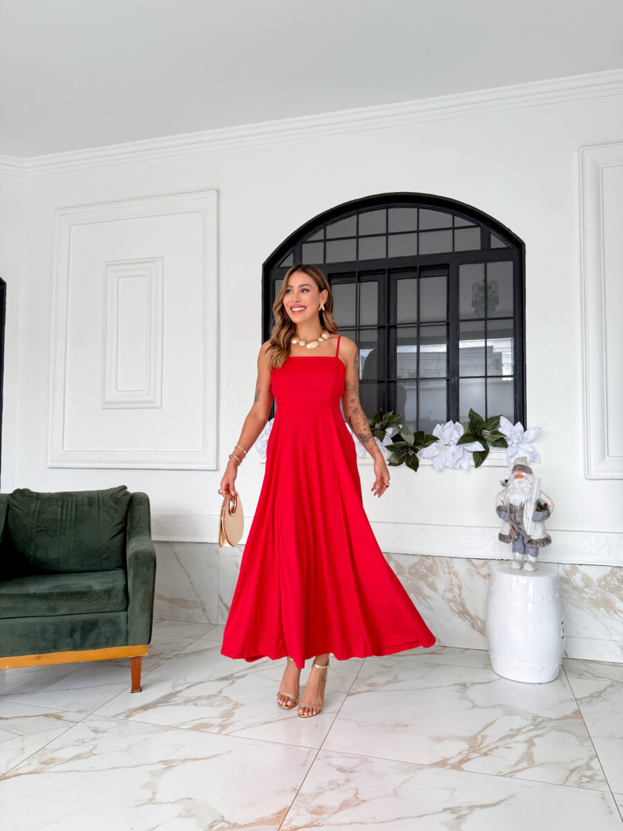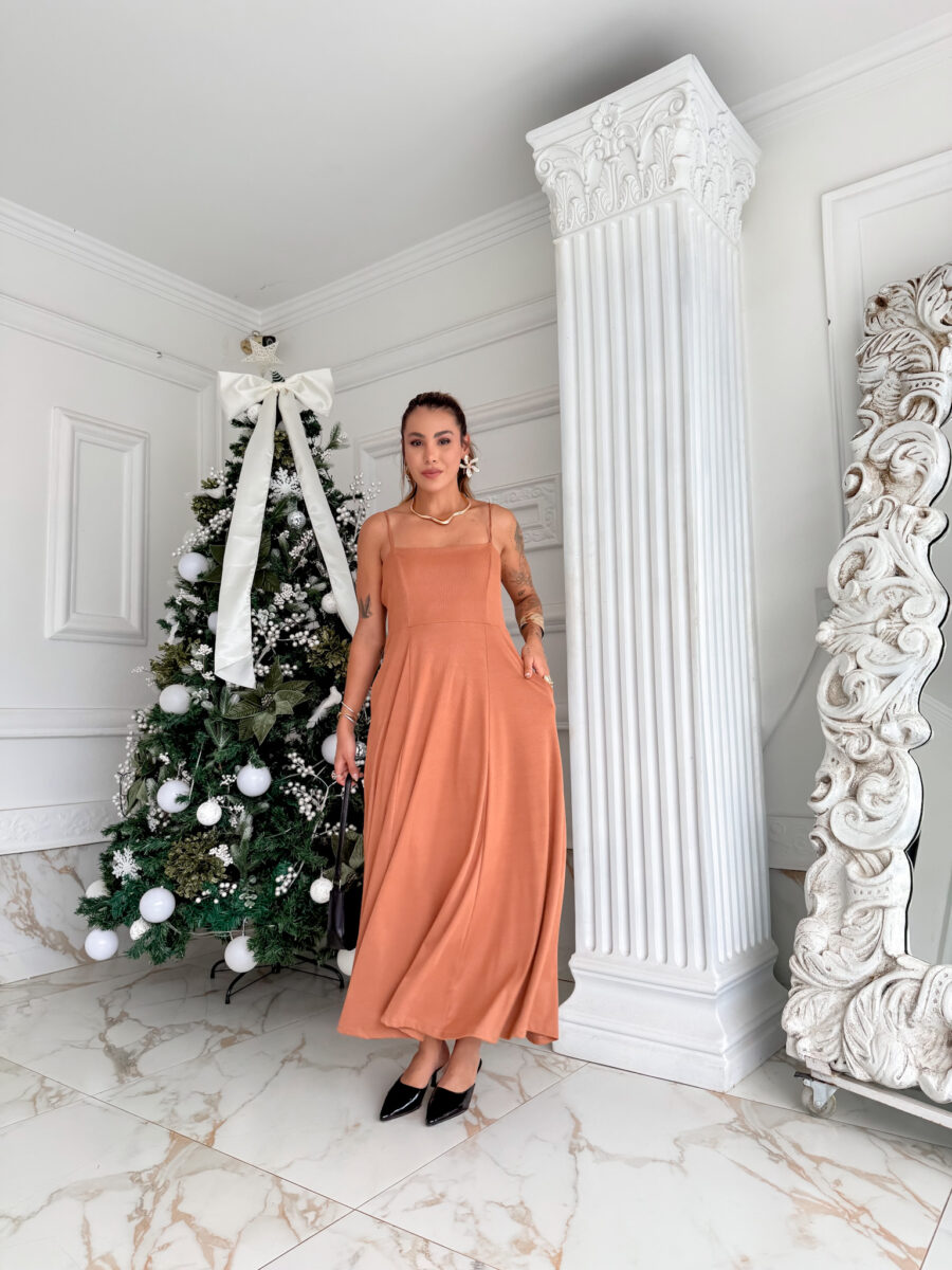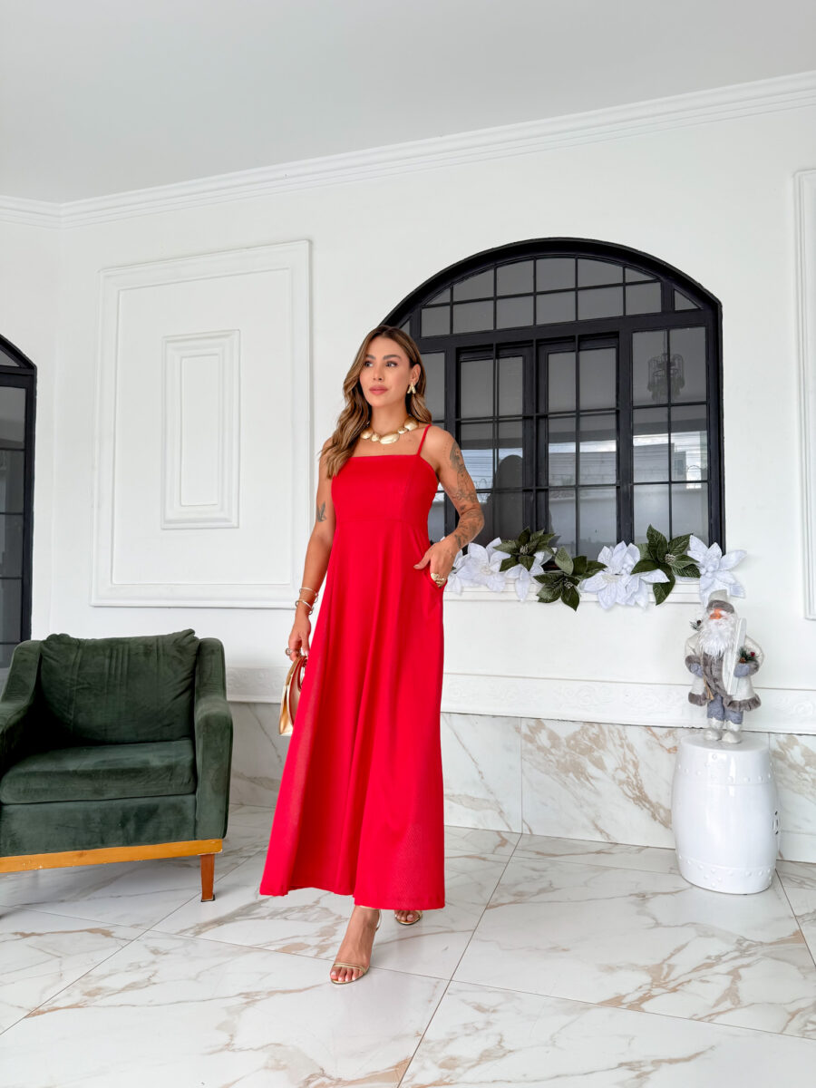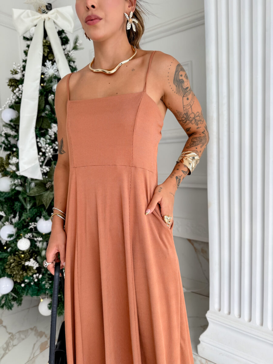 VESTIDO mídi rodado com bolso na lateral, alça fina elástico atrás