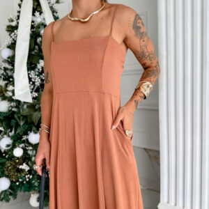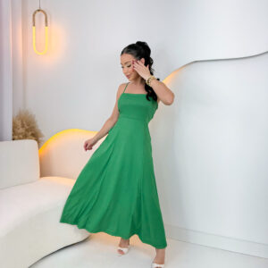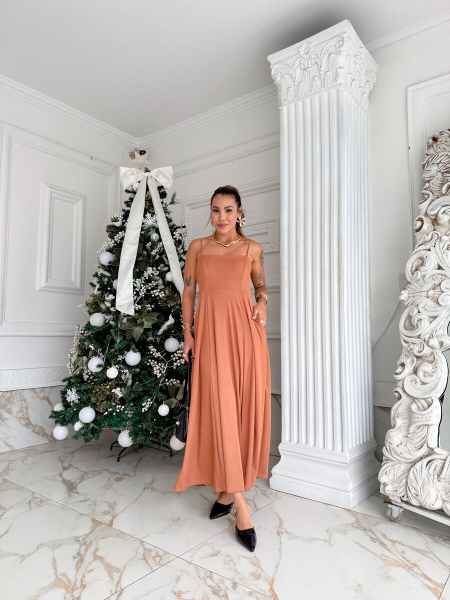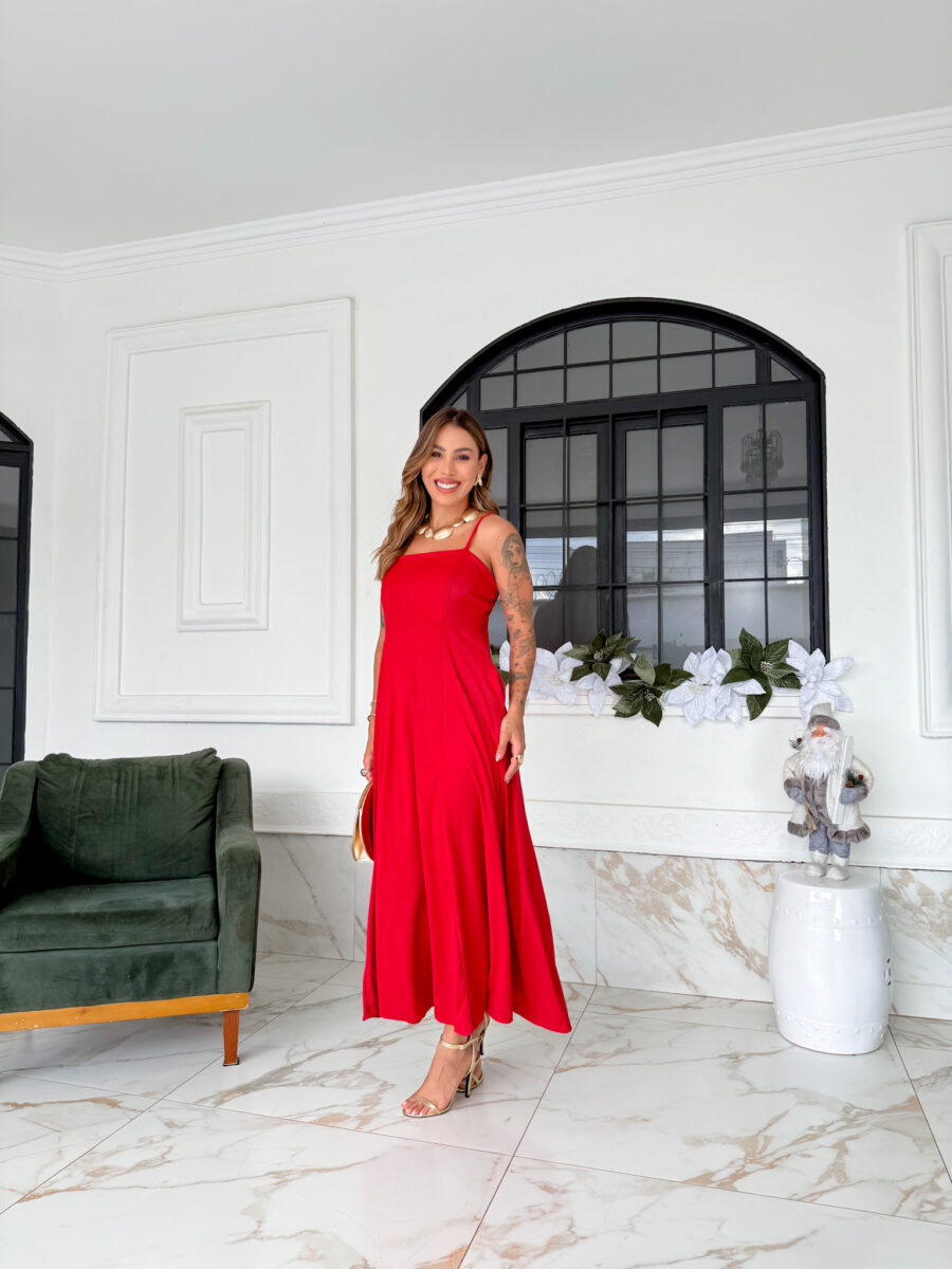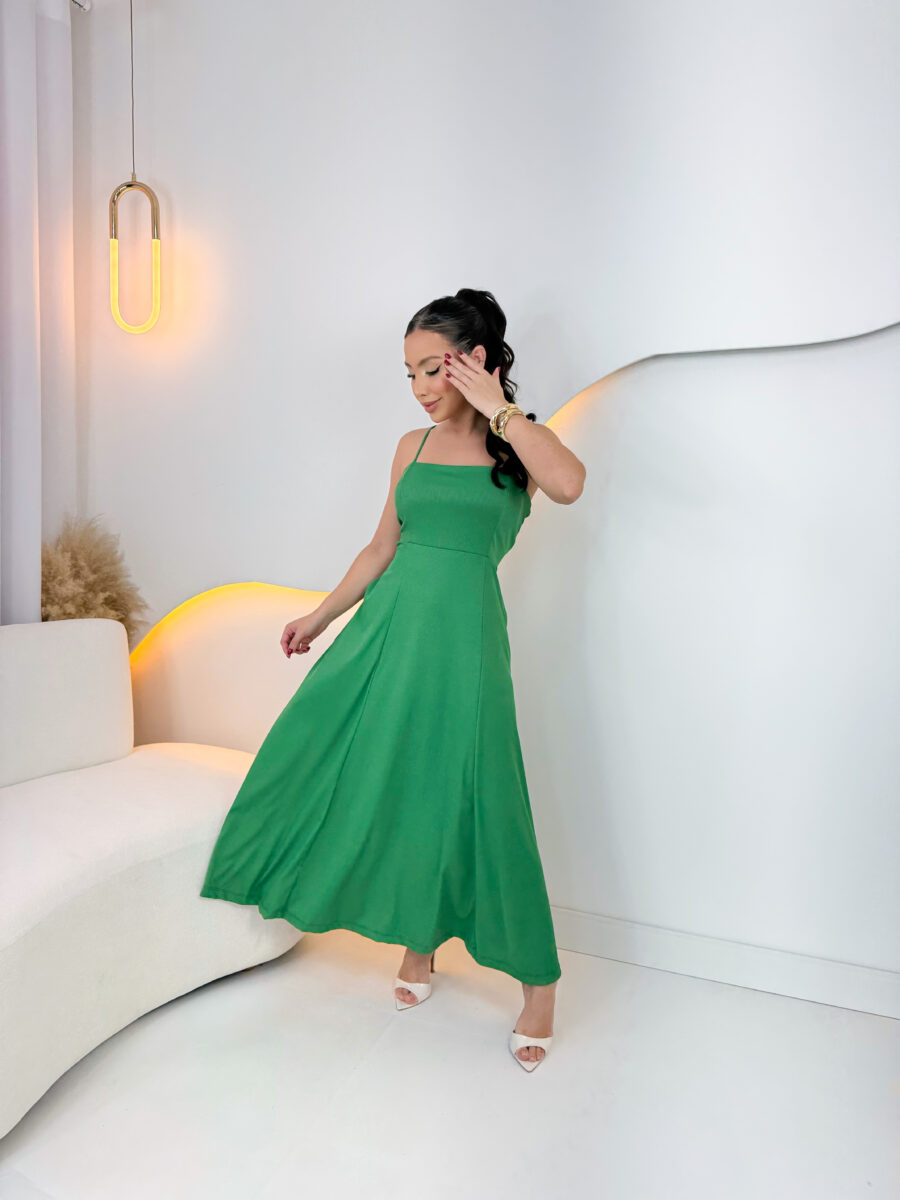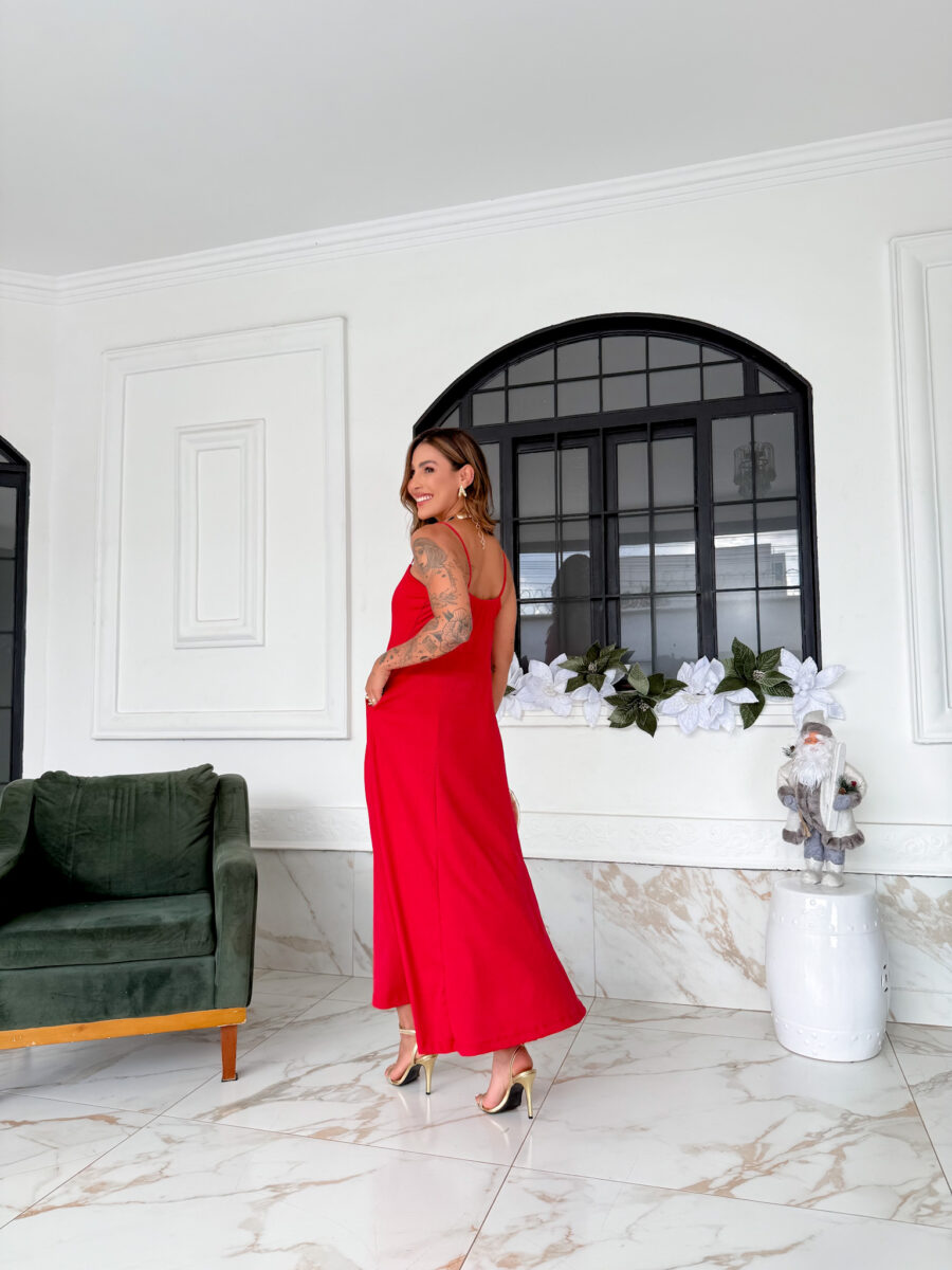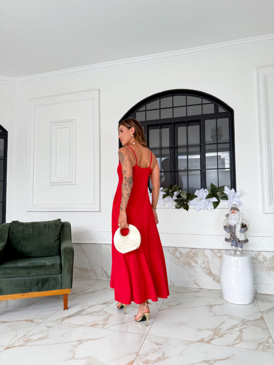 VESTIDO mídi rodado com bolso na lateral, alça fina elástico atrás