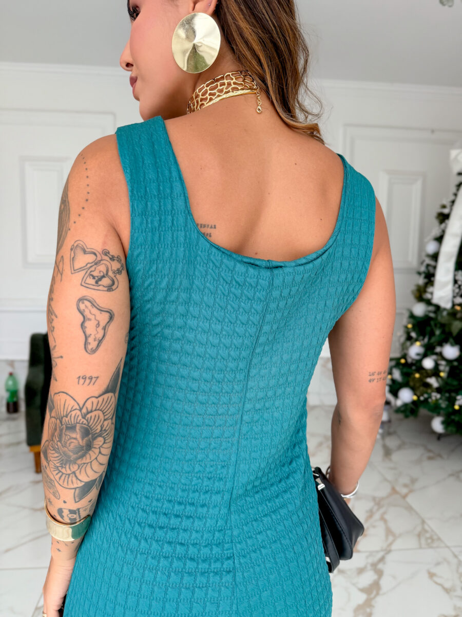 Vestido midi, com fenda peito duplo. Alça mais grossa.